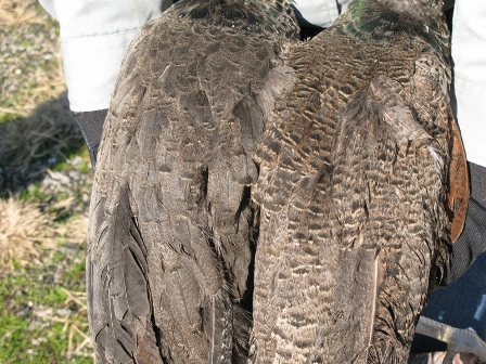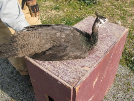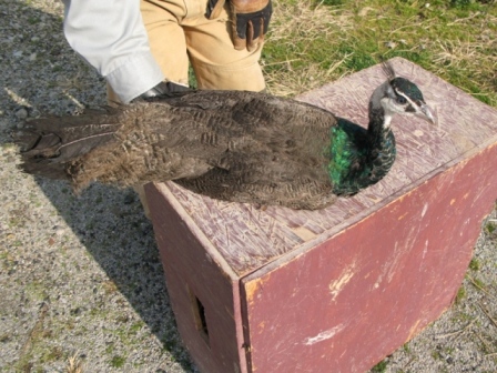 FAQFrequently Asked Questions about PeafowlQuestion: What is the difference between black shoulder and blue peafowl? Answer: Blue Hen Black Shoulder Hen Blue Male Black Shoulder Male Question: What do peafowl eat? Answer: Breeders eat a combination of Pheasant breeder pellets with 19% protein, small bite size dry dog food with 21% protein, and shelled corn (corn in the winter months only). Treats are lettuce, tomatoes, grapes, raisins, and bread. Adolescents (4 months to 1 1/2 yrs) eat a combination of chicken grower pellets with 18% protein, small bite size dry dog food with 21% protein, and shelled corn (corn in the winter months only). Chicks (1 day to 4 months) eat medicated chicken starter crumbles with 20% protein. Question: How long to peafowl live? Answer: 50+ years!! Question: How many days does it take for peafowl eggs to hatch? Answer: 27 to 30 Question: How old do peafowl need to be in order to breed? Answer: 2 years (Note: As long as the male's tail has a few eye feathers. If not, he will not be able to fertilize eggs.) Question: At what age does a peacock get his first long tail train? Answer: 3 years Question: What is the breeding season for peafowl? Answer: April to August Question: Does the male lose his tail every year? Answer: Yes, the male will molt the entire tail in late July or early August. Question: How often do peafowl need worming? Answer: Every 3 to 4 months. Especially, 1 to 2 months prior to the start of the breeding season and immediately following the end of the breeding season. See the Medications article for further details. Question: What is the recommended temperature for incubation? Answer: 99.5 degrees F. See the Incubation article for further details on Incubation. Question: What is the recommended humidity for incubation? Answer: 60% relative humidity or 86-87 degrees F wet bulb temperature. See the Incubation article for further details on Incubation. Question: How do I get peachicks to start eating and drinking? Answer: Peachicks are fed a medicated crumbled chicken starter feed which is easy for them to eat. Fresh water is provided in small quart jar waterers so that the chicks can easily drink without being able to drown themselves. For the first chicks of the season, a small glass marble is placed in a shallow feed dish so that the chicks will pick at the shiny marble and in turn, learn to pick at their feed. A marble is also added to the water, for the same reason. Older chicks teach younger chicks, so one chick is kept to teach the second batch to eat and drink and the cycle repeats for the rest of the season. Click here to see pictures of our peachicks. Question: How do I give peafowl medications orally (by mouth)? Answer: See our article on Oral Dosing. Question: How do I keep peafowl from flying up in trees? Answer: Clip one wing to keep peafowl from flying up in trees. Wing feathers will grow back in about 4 to 5 months. See our page on how to clip wings. Question: What is the best way to catch peafowl? Answer: The best way to catch peafowl in with a high quality net designed for poultry. The best ones to purchase have a tightly woven nylon mesh. This helps prevent injury to the birds. Question: Can peafowl be shipped? How? Answer: Yes, peafowl can be shipped via Express Mail through the United States Postal Service. Please see our Shipping Information page for more details. Question: Can a full tailed male peacock be shipped via Express Mail? Answer: Yes, a full tailed male can be shipped via Express Mail! Provided, the tail is wrapped, that is. See our article on preparing and wrapping a male's tail. Question: How can rat and mouse poison be safely used around peafowl? Answer: Tomcat bait stations can be safely used around peafowl. Question: What are the minimum housing requirements for green peafowl in cold climates? Answer: An insulated roosting area, with a heated roost, that will stay above freezing. A 10x10 or 10x12 utility building will easily a breeder pair or trio. Question: How big is a peacock egg compared to a chicken egg? Answer: A peacock egg is approximately 50% larger than a chicken egg. The picture shown below illustrates the size difference. Question: How to provide extra calcium to laying hens? How to minimize egg bound hens? Answer: Provide oyster shell free choice to laying hens. Oyster shell can be purchased at your local feed supplier. Question: How to sex India Blue and Black Shoulder chicks at 3 months of age? Answer: See photos below. BS Hen BS Male IB Male IB Pair IB Hen Question: What kind of a roost should be provided? Answer: A roost that is non-metal and flat rather than round. Preferably, at least 4 inches wide so that the birds can stand flat footed. This will allow them to cover their feet with their feathers preventing frostbitten toes. Question: Is silver pied a peafowl color? Answer: No, silver pied is a pattern of color that can appear on any color of peafowl. Some examples: India Blue Silver Pied, Black Shoulder Silver Pied, Purple Silver Pied, Cameo Silver Pied, and etc. Black Shoulder India Blue Question: When breeding two silver pied birds, what will the chicks be? Answer: The chicks produced will be 25% white, 50% silver pied, and 25% dark silver pied white eyed. For more details, see our peafowl Genetics section. Question: What type of netting is best for winter weather? Answer: Knotted nylon netting works best in areas where snow is common. It allows the snow to pass through rather than accumulate on the top. See below for pictures of knotted nylon netting as well as knitted netting, during a recent snowfall. The knitted netting doesn't allow snow to pass through. Knotted netting shown above Knitted netting shown above © 2010, Hopkins' Alternative LivestockWeb site designed and maintained by Lisa Hopkins